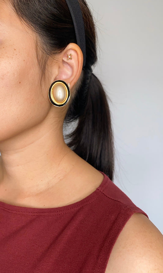 Vintage Carolee Faux Pearl & Black Enamel Clip-On Earrings