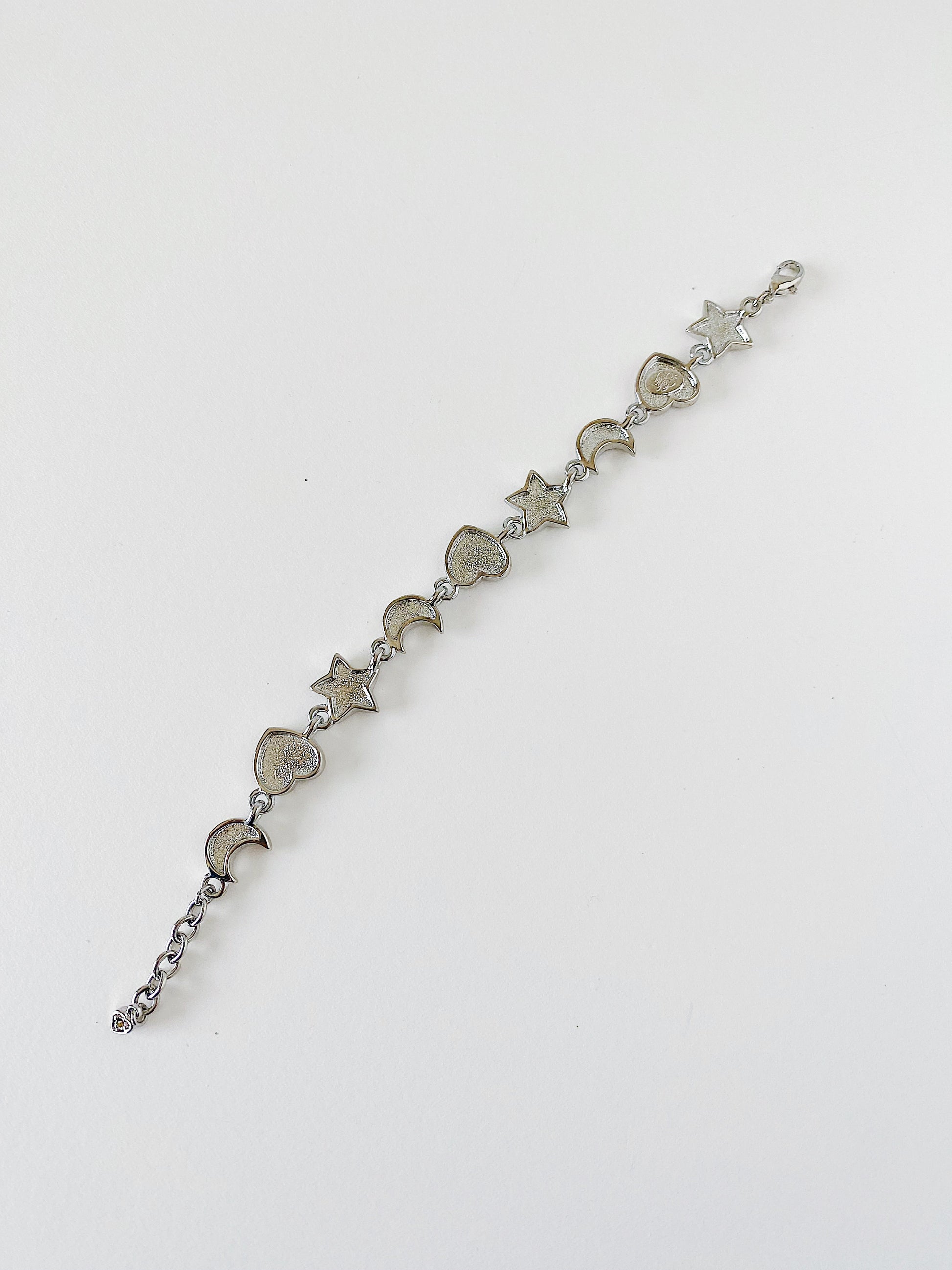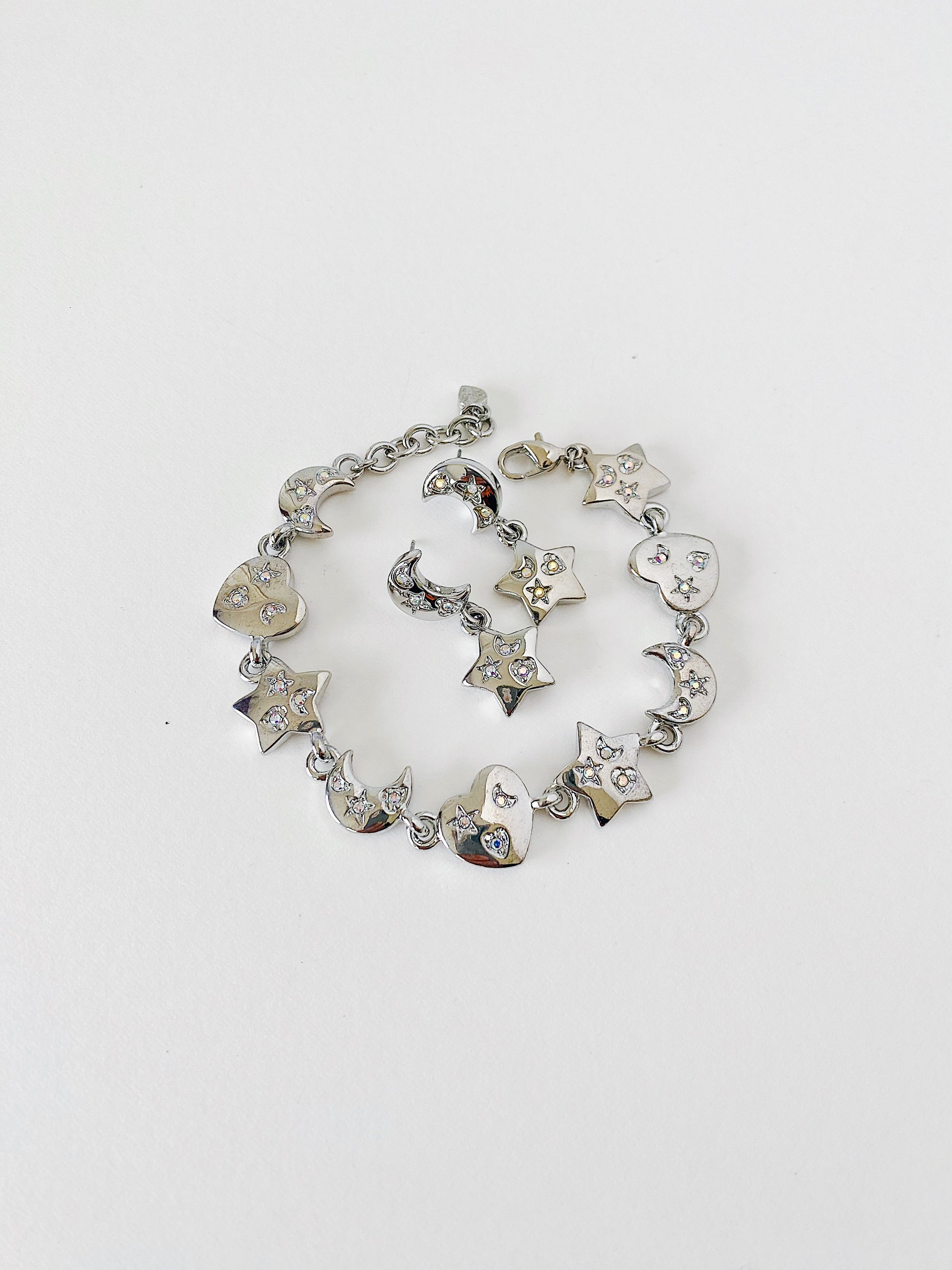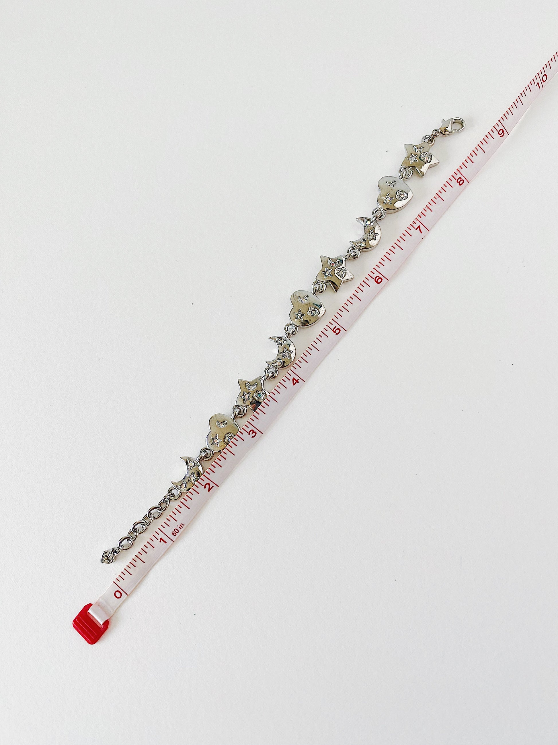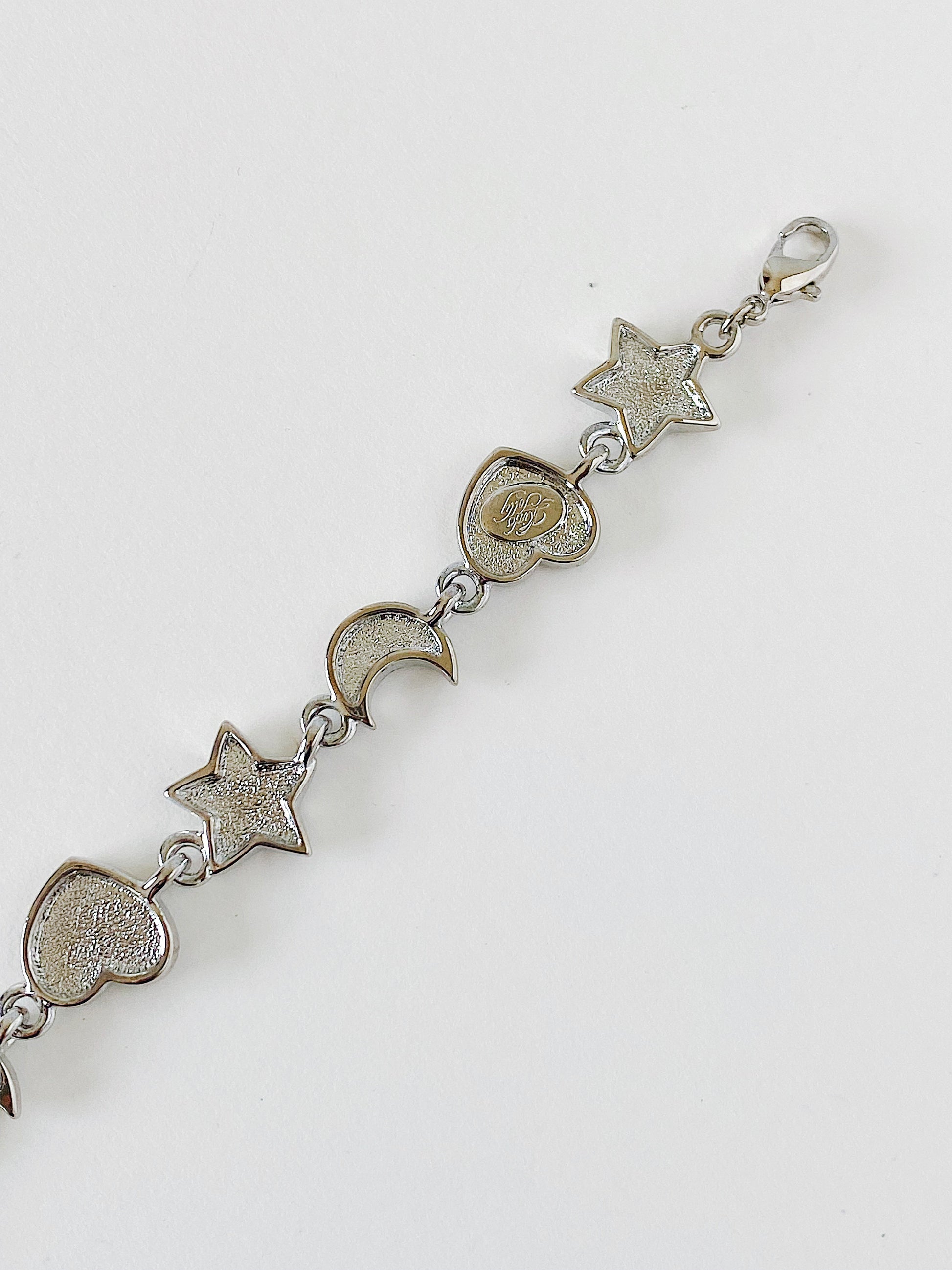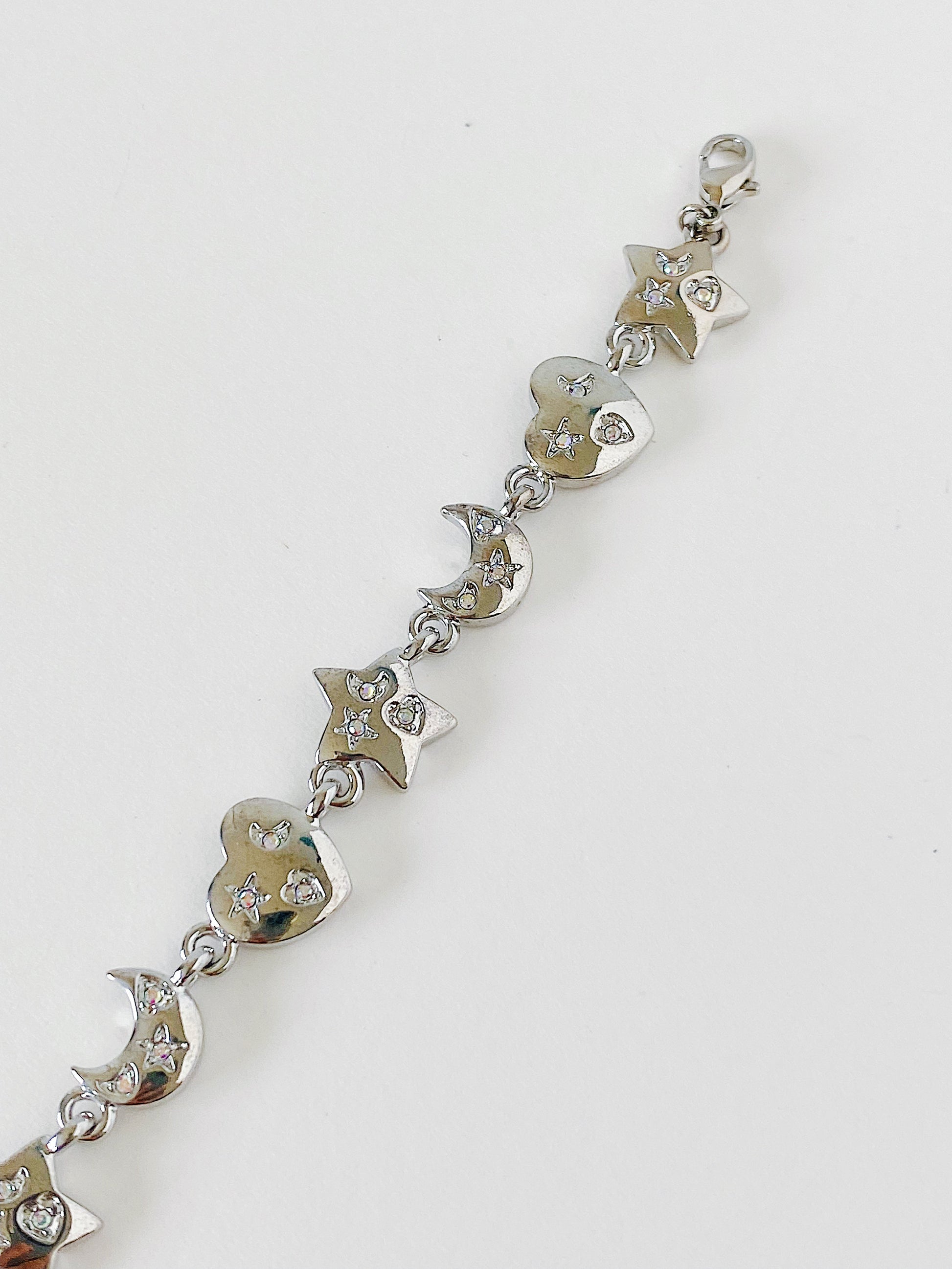 This vintage Kirks Folly moon and stars bracelet from the Y2K era is a fun, dreamy, celestial piece. Featuring crescent moons and stars in a silver-tone, the bracelet is adorned with shimmering aurora borealis rhinestones.