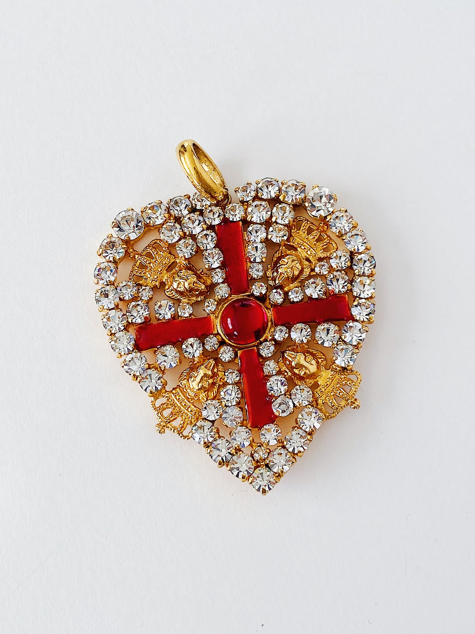 This 1990s vintage French designer Rena Lange large heart pendant features clear prong-set crystals, vibrant red enamel detailing, and a resin cabochon center in gold-plated metal.