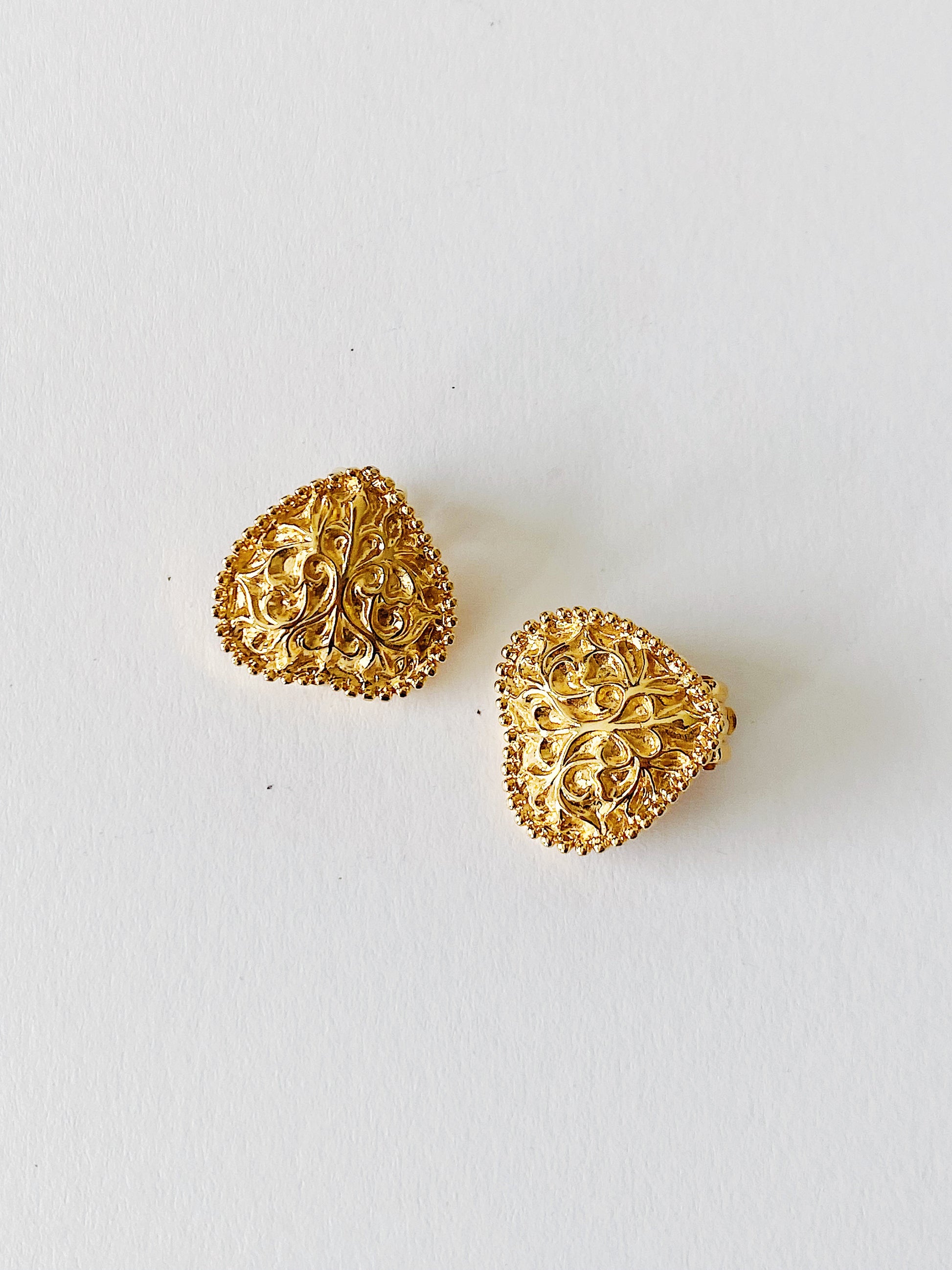 These late 1980s–1990s vintage St. John heart clip-on earrings are crafted in 24k gold-plated metal. Each heart features swirl detailing at the center . Mid-weight.