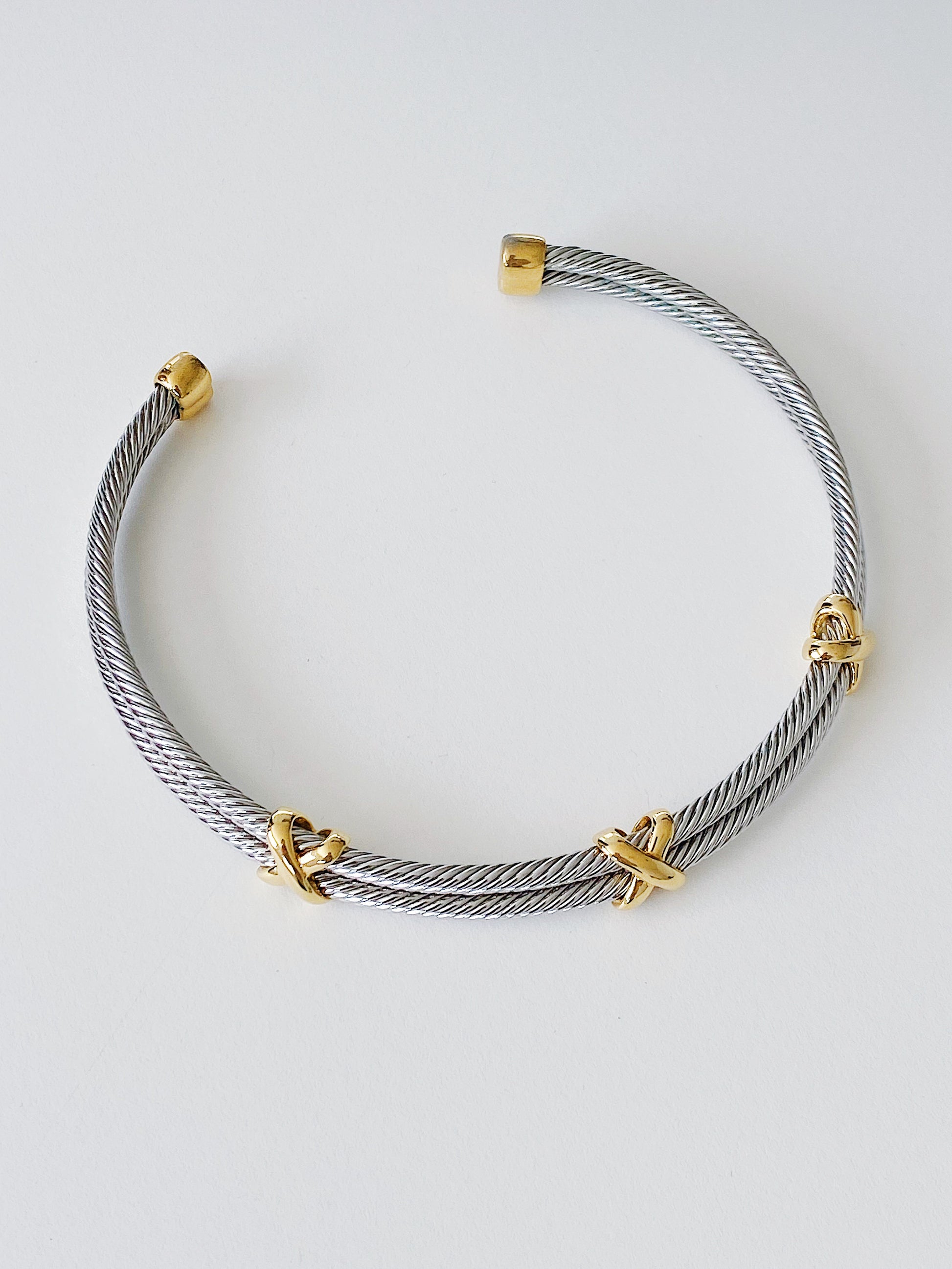Vintage 1990s two-tone twisted cable choker necklace featuring double stainless steel twisted cables accented with stationed gold-tone X motifs throughout. Heavy-weight with a semi-adjustable fit. This statement necklace sits beautifully at the neckline.